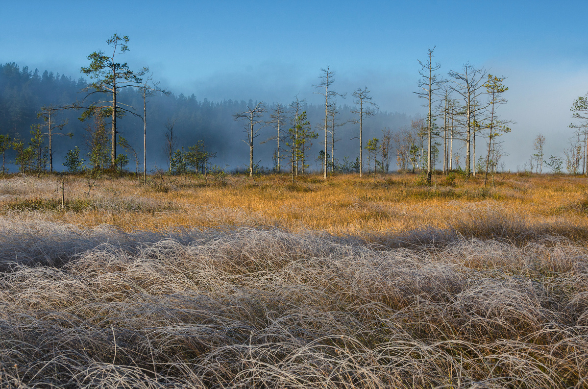 В прошлый понедельник, точнее в ночь с воскресенья на понедельник, в Ленинградской области обещали первый заморозок. А мне как раз нужно было рано утром ехать за город. И, естественно, я не мог пропустить такое событие. Собрал свой фоторюкзак и выехал пораньше. Но, так как в выборе маршрута я был ограничен, то локацию пришлось искать по дороге. Как назло, ничего интересного не попадалось ни в поле видимости, ни по карте. И вот, уже почти подъезжая к конечной точке маршрута, я заметил, что через придорожный лес просвечивает, открытое пространство. Жму на тормоз, натягиваю сапоги и бегом через лес, пока ещё солнце не поднялось слишком высоко. И да, вот оно! Перед глазами какое-никакое, а болотце. И шикарный туман над ним! Но пока я шлëпал по "болотной равнине", чтобы выбрать более-менее интересную точку съёмки, туман от меня убегал. Так мы и бегали по болоту, я за туманом, а он от меня. И чем дальше я шëл по болоту, тем дальше от меня удалялось вот это шикарное облако тумана. В конце