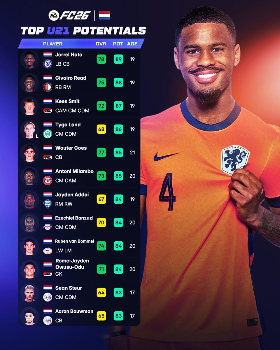 🇳🇱 Нидерланды продолжают творить магию тотального футбола ✨⚽️ Встречайте лучших молодых (до 21 года) игроков с самым высоким потенциалом в режиме карьеры FC26! 🔝 Готовы добавить немного голландского стиля в свою команду? 👀