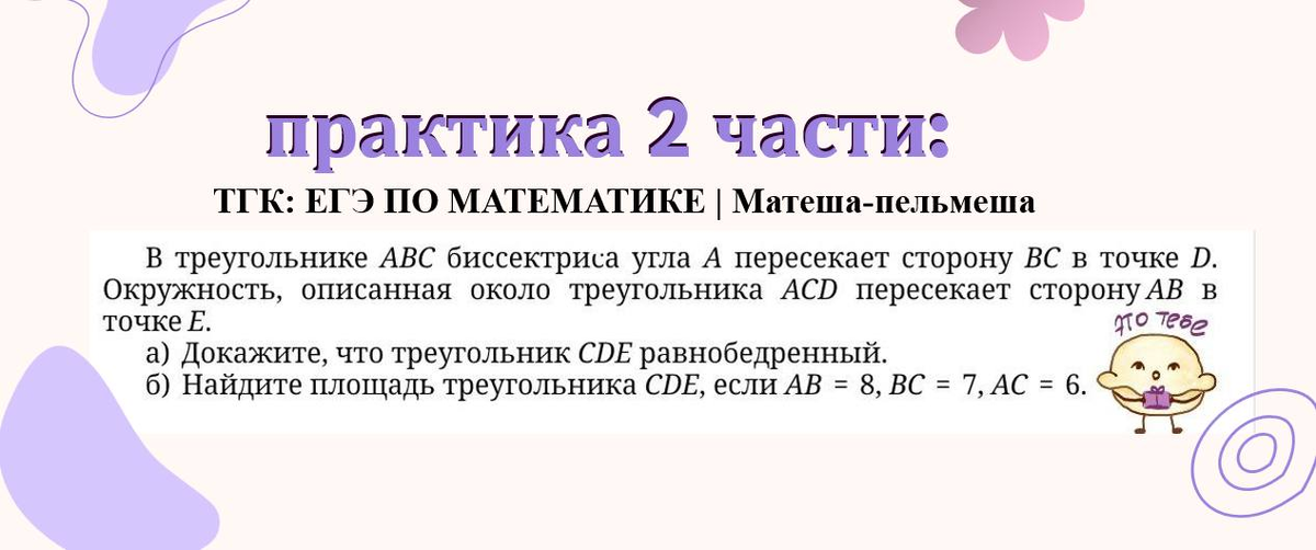 Посмотрите на эту классную задачку на 1 фото и попробуйте ее решить самостоятельно: В треугольнике ABC биссектриса угла A пересекает сторону BC в точке D. окружность описанная около треугольника ACD пересекает сторону An в точке Е . докажите ,что треугольник CDE равнобедренный . найдите площадь треугольника CDE если AB=8, BC=7, AC=6 СОВЕТУЕМ только после пары попыток открывать наше решение и сравнивать ВАЖНОЕ ЗАМЕЧАНИЕ ПО №17: в 80% случаев в задаче с биссектрисой используется ее свойство: биссектриса треугольника делит противолежащие сторону на отрезке пропорциональные прилежащим сторонам ик стати, эту задачу можно решить изи и вторым способом, есть идеи как? если хотите разбирать этот кринж крутой матан индивидуально или в мини-группах, то заполняйте анкету или пишите в лс: @Katrin_math или @ogo_oge2025
