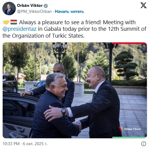 🇦🇿🇭🇺 Премьер-министр Венгрии Виктор Орбан опубликовал сообщение о своей встрече с Президентом Азербайджана Ильхамом Алиевым, которая