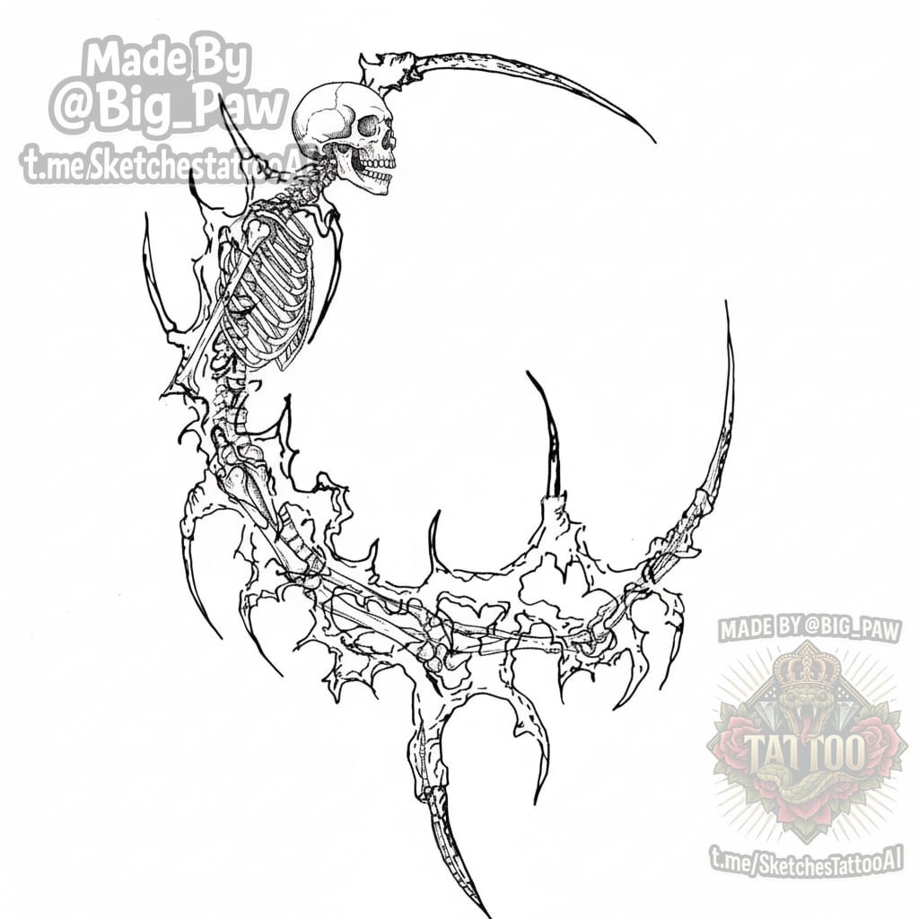 #2762 Подборка по запросу подписчика - Можно что то на подобие этого, только что бы скелет был вписан в аккурат в край и видно его было только если приглядеться? 🧠 SYNTX - создай свой эскиз 💎 Информация - все услуги 💀 Эскизы от нейросети #киберсигелизм #скелет #узор #эскиз #тату #татуировка