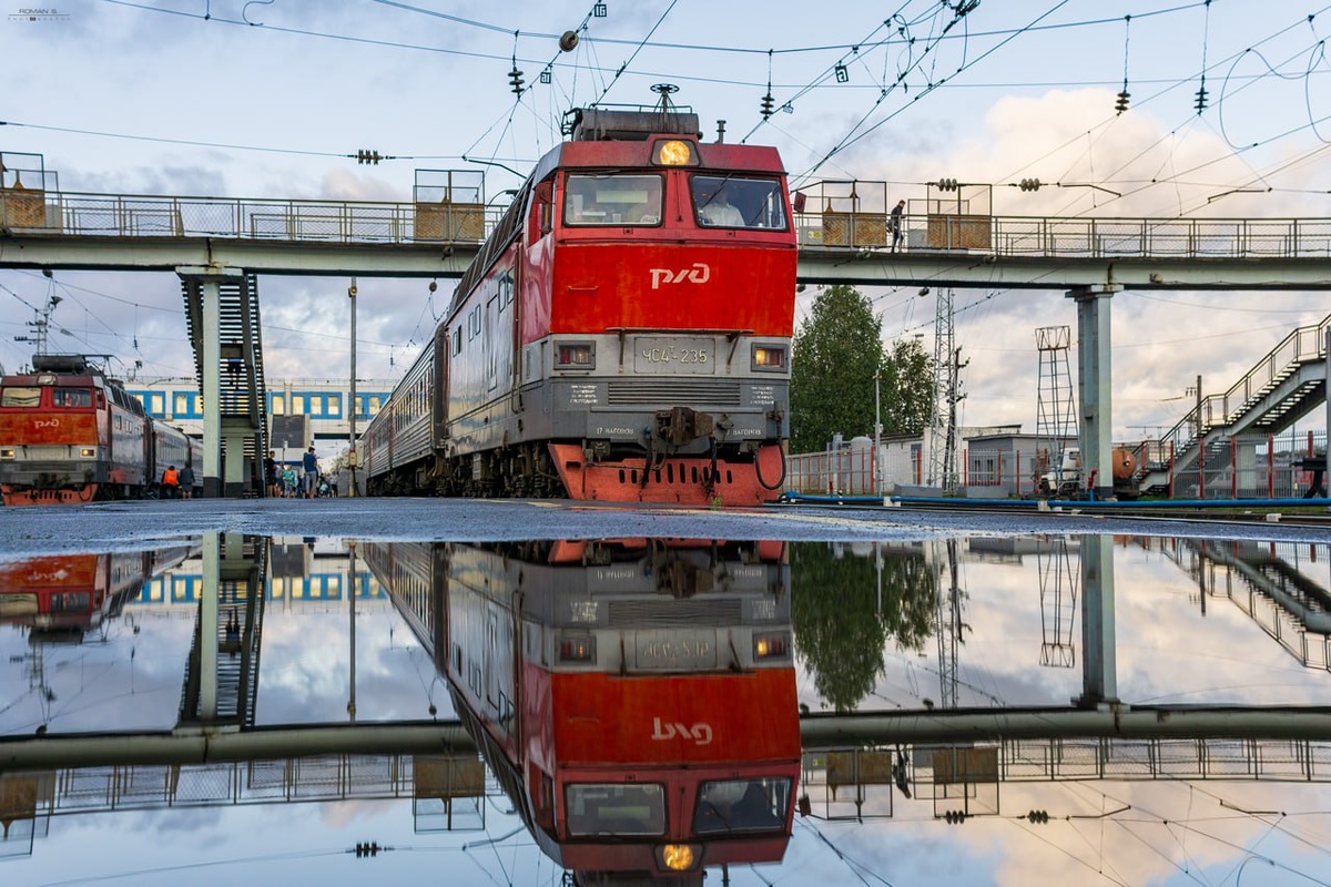 Перрон станции Киров после сильного дождя, на фото ЧС4т-235