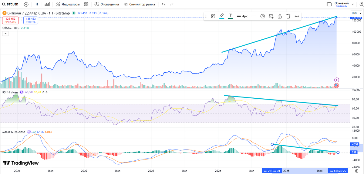 Биткоин продолжает покорять ценовые вершины. Однако, нужно понимать, что до небес он расти не будет. На графике видна сильная дивергенция. Настолько сильная, что прямо кричит о развороте. Что делать? Полагаю, самое время распродать крипто-котлету. Можно оставить себе самый минимум крипты. P.S.