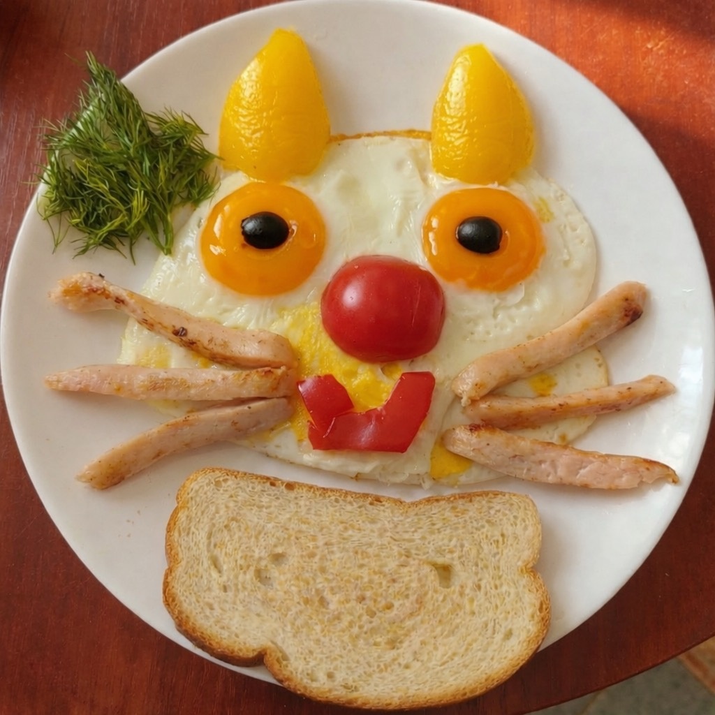 Продукты: 1) Яйца куриные - 3 штуки 2) Жёлтый перец - 1 штука 3) Красный перец - 1 штука 4) Маслины - 1 штука 5) Помидор - 1 штука 6) Сосиска - 1 штука 7) Растительное масло - 20 мл Рецепт: 1) 2 яйца на политой растительным маслом сковороде мы жарим так, чтобы они получились в меру компактными, а одно так, чтобы оно получилось как бы длинным и размазанным. Первые мы используем для создания верхней части мордочки котика, а второе - для нижней. 2) Когда яйца будут готовы, аккуратно выкладываем их лопаткой на тарелку. Два в меру компактных яйца мы кладём друг рядом с другом сверху, а одно как бы размазанное и длинное - внизу под ними. 3) Затем мы жарим на сковороде сосиску. 4) А дальше мы вырезаем 2 треугольника из жёлтого перца и кладём их поверх самой верхней части нашей яичницы. Это будут уши котика. 5) Прямо в середину желтков мы кладём 2 половинки чёрных маслин. 6) Вместо носа у нас помидор. 7) Из жареной сосиски делаем усы. 8) А в качестве рта сгодится красный перец. Вот