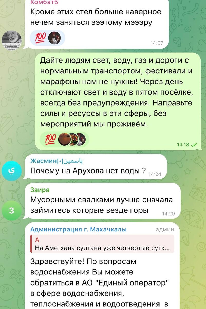 ©Уважаемый «Черновик», кроме вас мы никому не нужны. Беспредел в работе АО ЕОРД продолжается. Эта организация оставляет тысячи людей без воды на сутки через сутки, о своей работе руководитель (кто он вообще? или она?) не распространяется, в детали не вдаётся. Жители Ленинского района Махачкалы сидели без воды больше 14 часов 3 октября, 7 часов — 4 октября и сегодня, с 14 часов дня и по настоящее время. А ещё были без воды в сентябре, августе, июле… На мои комментарии ни Администрация Махачкалы, ни ЦУГ Махачкалы не ответили, я писала ещё в ТГ-канал градоначальника, но оттуда комментарий удалили. Вот так, нас просто удаляют, чтобы не мешались под ногами, вероятно. Махачкалинцы просят о нормальной жизни с водой, светом, газом, а им - фестивали, ярмарки, открытия памятников. Нам, простым людям, без джипов и должностей, лучше задуматься о переезде отсюда, а они пусть остаются и фестивалят дальше." #нам_пишут Подписаться на "Черновик" 2.0 | Обратная связь: @chernovik_1_bot