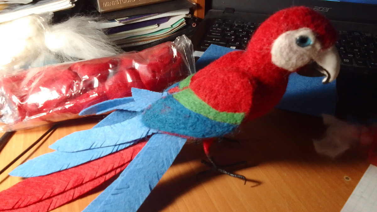 Делаем щёки Делаем клюв Из полимерной глины. У меня Крафт белая. Клюв из 2х деталей. Красим клюв Приклеиваем. Я на УХУ универсальный (но обычно пользуюсь Моментом Кристаллом) Обрезка фото у меня не работает - терпите))) Теперь лапы Вставляем лапы Делаем выемку под глаза Вставляем глаза - лучше белые с чёрным зрачком и наверно поменьше чем у моего попугая (1 см). Только не с бегающим зрачком. Игрушка готова!