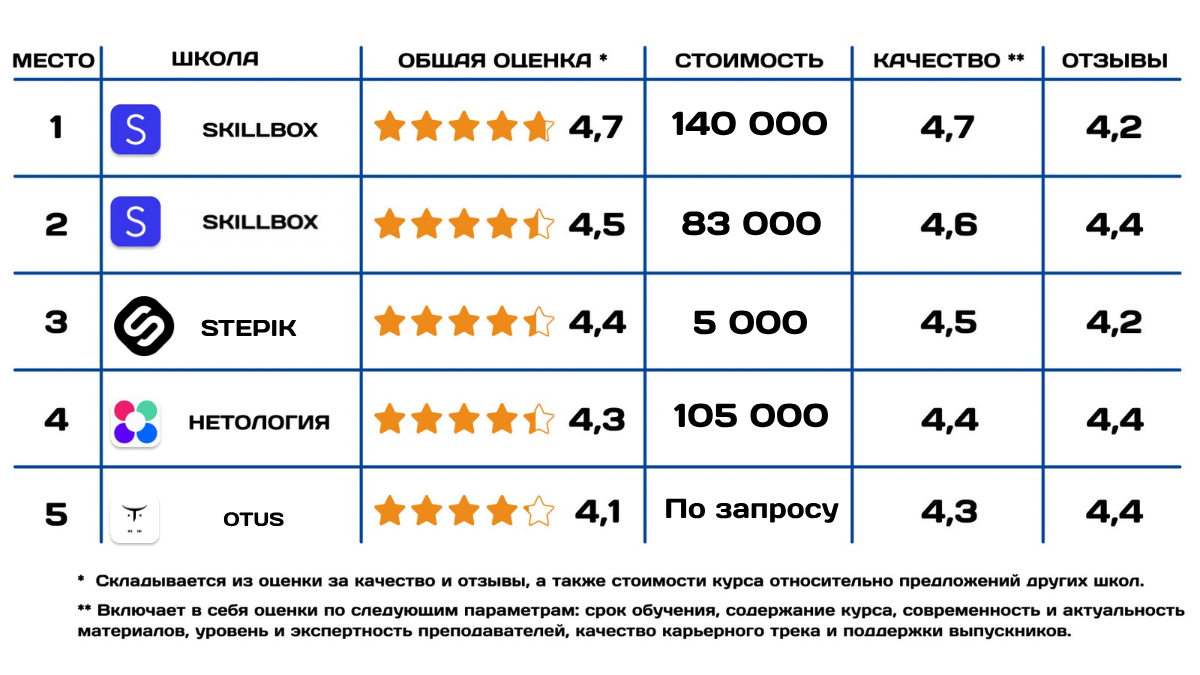 Skillbox — крупнейшая онлайн-школа по прикладным профессиям. Редакция изучила более 20 агрегаторов с отзывами о школе и её курсах, это более 4000 историй от реальных студентов школы. Средний рейтинг школы Skillbox – 4,38 из 5.