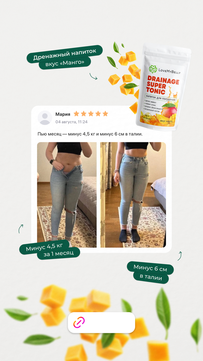 Мечтаете не просто о цифре на весах, а о реальных изменениях в зеркале? Тогда этот результат для вас! Наша покупательница Мария за месяц с дренажным напитком «Манго» получила двойной эффект: ✔️ Минус 4,5 кг ✔️ Минус 6 см в талии А другой наш клиент за 1,5 месяца избавился от отеков и убрал -3 кг с напитком «Вишня». Результат, который сложно не заметить! Хэштеги: #результат #дренажныйнапиток #минусмвталии #отеки #стройность #достижения