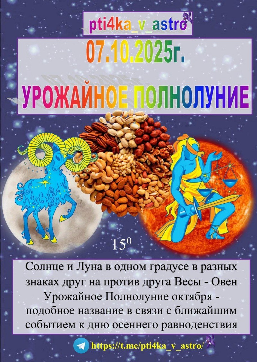🌕 Первое Осеннее Суперлуние 🌾 Урожайная Луна 🗓️ 07.10.2025г. в 06:47:51 мск 🌕 Суперлуние - это, когда Луна приближается к Земле Сейчас многие могут почувствовать влияние ночного светилы🌏 ☀️♎ Солнце находится в воздушном, неуверенном знаке Весы А Луна в огненном, прорывном, порывистом знаке Овен 🌕♈ 👓 Меркурий - планета интеллекта днём ранее, зашла в колючий и мстительный знак Скорпион ♏ ⏳ Прекрасное время для исцеления своих душевных травм 🦋 Подойдут танцы, пение, спорт 🍊Обратите внимание: 💆 На голову, сосуды, глаза, нос и уши ♀️ на жкт, гормональный и эмоциональный фон (нервы) 🍊Добавьте в свой рацион фрукты 🍋 💧Следите за питьевым балансом, режимом сна и отдыха 🛌 💊 Принимайте витамины, минералы и таблетки правильно 🌕 Совет на месяц 🌙 что необходимо исцелить? Ставьте любой смайлик, чтобы получить совет 😉 За подробной информацией пишите @pti4kaVastro #Полнолуние #Советы #Ритуал