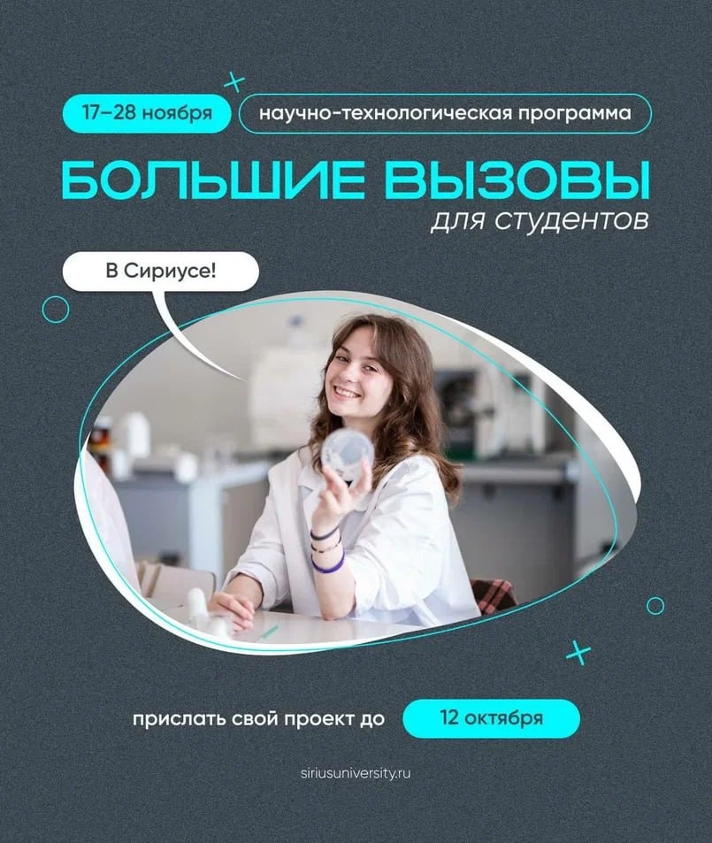 🙌Молодых ученых Хакасии приглашают принять участие в научной программе В Университете «Сириус» открыт приём заявок на Научно-технологическую программу «Большие вызовы». Принять участие могут: 🔸победители и призёры Всероссийского конкурса научно-технологических проектов «Большие вызовы» 2023–2025 гг. (учащихся 11 классов или студентами 1–2 курса СПО) 🔸победители профильных федеральных олимпиад и конкурсов 🔸обучающиеся, имеющие высокие академические результаты и рекомендованные Учёными советами образовательных организаций Участников ждёт разработка проектов в составе команд под руководством ведущих учёных и экспертов, защита идей в формате научно-практической конференции, а также участие в мероприятиях Конгресса молодых учёных. Программа пройдёт с 17 по 28 ноября📆 👉 Подать заявку можно до 12 октября на сайте 😀ХГУ I Подписаться 📱 Одноклассники 📱 Rutubе 📱 Дзен ™️ВКонтакте #ХГУ #вуз #наука #khsu #молодыеученые