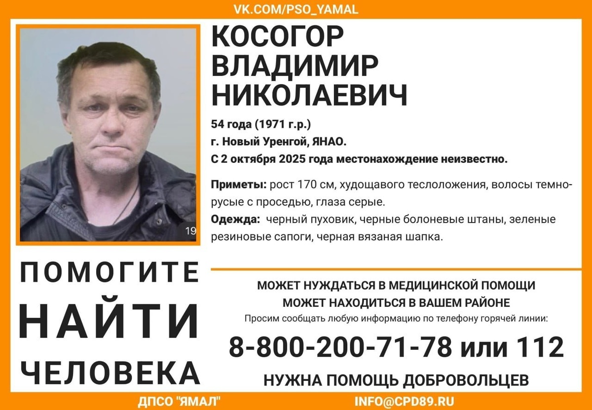Со 2 октября представители поисково-спасательного отряда «ДПСО ЯМАЛ» ищут жителя Нового Уренгоя Владимира Когора, который исчез и его местоположение остается неизвестным.