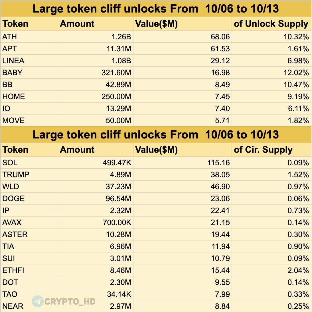 #анлок 🔓 ТОП разблокировок токенов с 6 по 13 октября! Cliff Unlocks: ▫️#ATH – $68,06m ▫️#APT – $61,53m ▫️#LINEA – $29,12m ▫️#BABY – $16,98m ▫️#BB – $8,49m ▫️#HOME – $7,45m ▫️#IO – $7,40m ▫️#MOVE – $5,71m Linear Unlocks: ▫️#SOL – $115,16m ▫️#TRUMP – $38,05m ▫️#WLD – $46,90m ▫️#DOGE – $23,06m ▫️#IP – $22,41m ▫️#AVAX – $21,15m ▫️#ASTER – $19,44m ▫️#TIA – $11,94m ▫️#SUI – $10,79m ▫️#ETHFI – $15,44m ▫️#DOT – $9,55m ▫️#TAO – $7,99m ▫️#NEAR – $8,84m P.S. Cliff Unlocks – разблокировка крупной порции токенов единовременно в конкретную дату. Linear Unlocks – постепенная разблокировка токенов в течение определенного периода (обычно каждый день или каждую неделю по части). Crypto Headlines