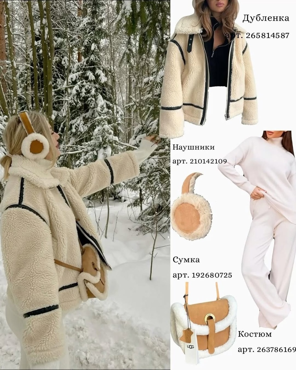 Зима просит мягких фактур, объёма и спокойной палитры. На этих фото — как раз такие сочетания: нежные шубки-дублёнки, уютный трикотаж и грамотные акценты карамельных и сливочных тонов. Ниже — подробный разбор каждого комплекта по порядку с артикулами, нюансами посадки и профессиональными подсказками, чтобы вы легко повторили понравившийся образ. Образ 1. «Сливочный нордик» — прогулка в парке Мягкая светлая дублёнка с контрастной отделкой держит форму, но не утяжеляет силуэт. Трикотажный костюм в тоне молока создаёт цельный, вытянутый образ. Пушистые наушники добавляют игривости и реально спасают от ветра. Мини-сумка на длинном ремешке — тёплая карамель, она поддерживает оттенок отделки дублёнки. Что на фото: Детали и посадка: Дублёнка укороченная, длина до бедра — это визуально балансирует объём верха и не «съедает» рост. Костюм средней плотности, без лишней рыхлости: не добавляет объём в зоне бёдер и колена, красиво драпируется в движении. Наушники мягкие, с широким ободом — не давя