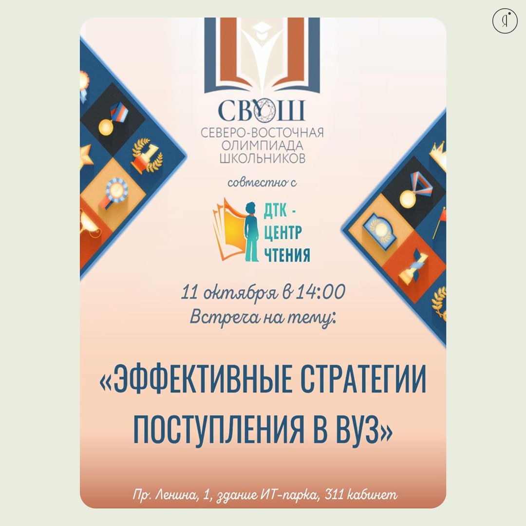 «Эффективные стратегии поступления в вуз» #МК Факультет довузовского образования и профориентации СВФУ приглашает вас на важную встречу, посвященную поступлению в вузы. Тема: «Эффективные стратегии поступления в вуз» На встрече подробно разберут: 🤩 Актуальные правила приёма в 2025/2026 учебном году 🤩 Как грамотно помочь ребёнку с выбором ЕГЭ и направления обучения 🤩 Льготы, олимпиады и возможности целевого обучения 🤩 Подготовительные курсы от СВФУ 🤩 11 октября |14:00 детская библиотека «ДТК – Центр чтения» пр. Ленина, 1, здание ИТ парка, каб. 311 🤩Участие бесплатное, но количество мест ограничено. Регистрация обязательна по ссылке 🤩 Online Якутия | Ждем вас в МАХ