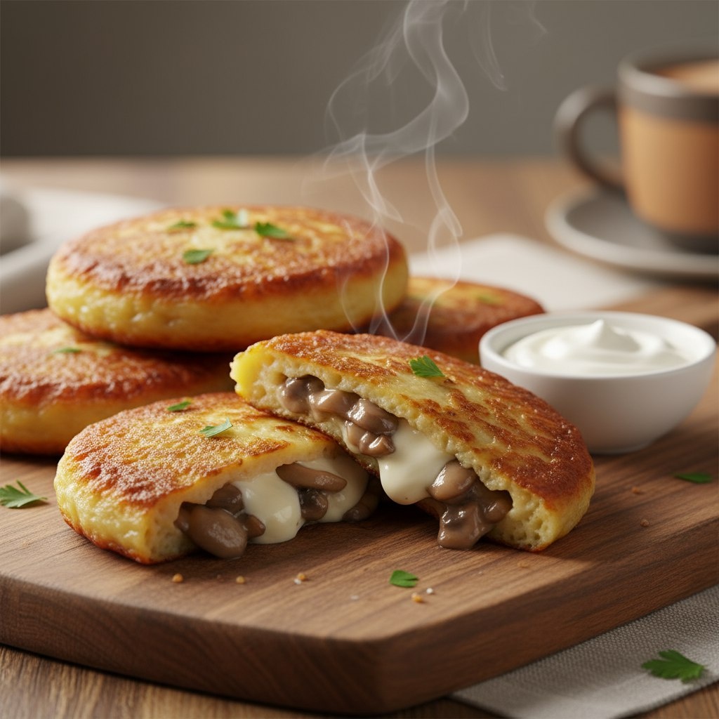 Пошаговый рецепт драников с сочной начинкой из сыра и грибов. Как сделать любимое блюдо ещё вкуснее и эффектнее. Почему это стоит попробовать Драники — блюдо, которое знакомо каждому, но с начинкой они становятся маленьким кулинарным сюрпризом. Внутри хрустящей картофельной оболочки скрывается нежный сыр, ароматные грибы или сочная мясная масса. Это идеальный вариант для завтрака, ужина или разнообразия праздничного стола. Ингредиенты - 5–6 средних картофелин - 1 яйцо - 1 ст. л. муки - Соль, перец по вкусу - Масло для жарки Начинка - 100 г шампиньонов - 50 г твёрдого сыра - 1 небольшая луковица - 1 ст. л. растительного масла - Зелень для аромата Пошаговое приготовление 1. Начинка — нарежьте грибы и лук мелкими кубиками, обжарьте до мягкости, добавьте тёртый сыр и зелень. Остудите. 2. Картофельная масса — натрите картофель на мелкой тёрке, отожмите лишний сок. Добавьте яйцо, муку, соль и перец. Перемешайте. 3. Формирование драников — капните ложку картофельной массы на сковороду