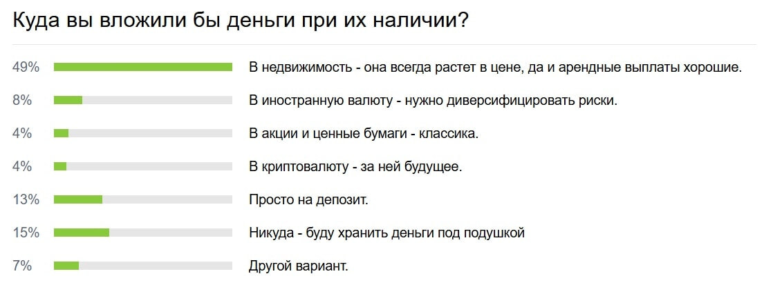 Мы решили поинтересоваться у хабаровчан, куда бы они вложили деньги при их наличии. 49% заявили, что выбор пал бы на недвижимость, ведь она всегда растет в цене. 15% предпочли бы хранить средства «под подушкой», 13% просто положили бы деньги на депозит, 8% выбрали бы для вложений иностранную валюту, 7% нашли бы другой способ, который в опросе не указан. 4% выбрали бы акции и ценные бумаги, и оставшиеся 4% предпочли бы криптовалюту, ведь за ней будущее. Отметим, что на главной странице DVHAB.ru каждую неделю проводятся опросы на самые актуальные и острые темы. Найти вы их можете, пройдя по ссылке. Напомним, что ранее хабаровчане назвали минимальные зарплаты для смены работы. Каждый четвертый согласился бы сменить работу при зарплате от 100 до 150 тысяч рублей, показал наш опрос. Еще 24% респондентов выбрали вариант от 150 до 200 тысяч рублей.