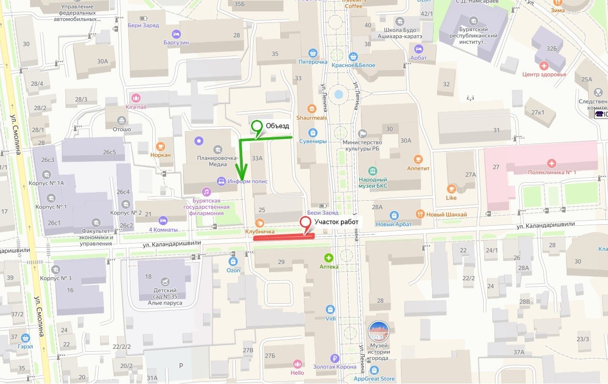 Будет временно ограничен въезд для автомобилей во дворы домов на улице Ленина, 31 и 33. Жителям рекомендовано объезжать со стороны ул. Каландаришвили, д. 23.