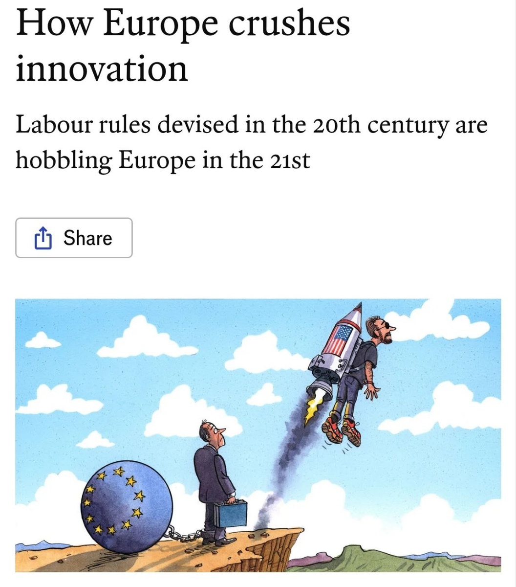 Согласно The Economist, сложные процедуры увольнения в Европе тормозят инновации. Компании боятся рисковать, потому что увольнение сотрудников требует долгих консультаций с профсоюзами и стоит дорого. В отличие от США, европейцы вынуждены содержать неэффективных персонал, что мешает развитию прорывных технологий. Информация не нашла подтверждение в других источниках.