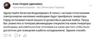 Вячеслав Гладков обещал дать рекомендации от властей по выбору бытовых генераторов Накануне жителям частных домов советовали запастись дополнительными источниками электроснабжения. Обеспечить каждый дом генератором невозможно, но тем, кто не сможет этого сделать, в случае проблем с энергоснабжением предоставят ПВР, отметил губернатор. Сейчас покупка генератора – одна из самых частых тем в соцсетях. Белгородцы обсуждают их стоимость, возможность заправки, качество и параметры. Одна из жительниц в комментариях в ВК главы региона попросила рассказать, какой генератор лучше выбрать. «Анна Петруня, если не ошибаюсь, в девичестве Демченко, которая попросила рассказать в социальных сетях, дать рекомендации, какие генераторы нужно для своего дома закупить, исходя из объёма потребляемой мощности, котла для обогрева, который стоит в доме, количества холодильников и других нагревательных или осветительных приборов. И, конечно же, мы постараемся максимально быстро – не позднее, чем в завтрашн