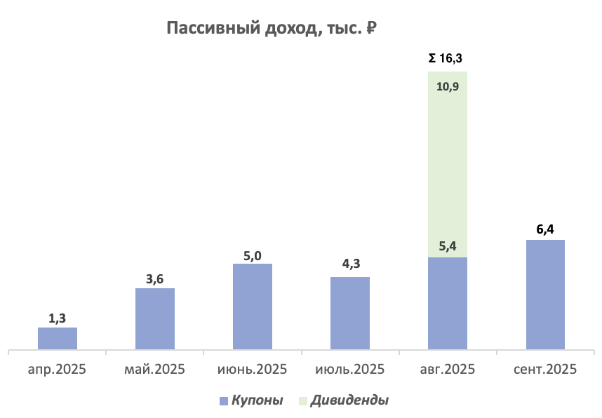 Подвожу итоги сентября в части пассивного дохода по своему портфелю. В сентябре я получал только купоны. Выплат дивидендов не было. В сумме я получил 6,4 тыс. рублей. Результат, в целом, не плохой. Выплаты купонов в сентябре превысили прежний максимум купонных выплат за август в сумме 5,4 тыс. рублей.
