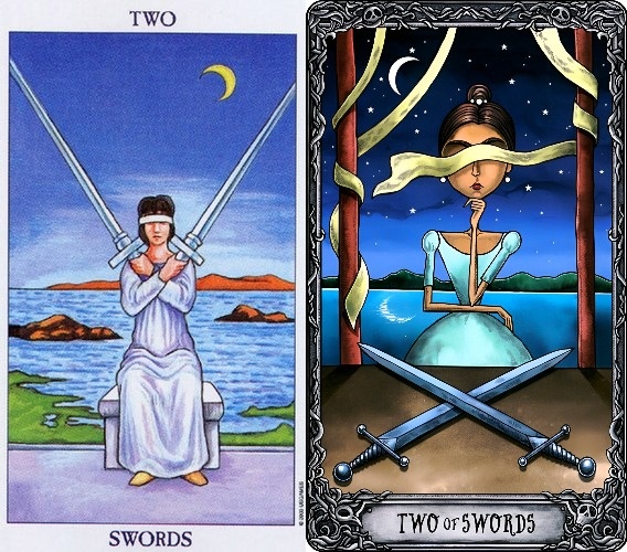 В данной колоде Таро 2 мечей представлена в загадочном образе. На карте изображена женщина, сидящая на морском берегу. Ее лицо скрыто плотной повязкой, а скрещенные на груди руки, сжимают два длинных и тяжелых меча. Позади женщины можно наблюдать морской штиль (отсутствие эмоций), а так же растущую луну в небе (подсознательные процессы).