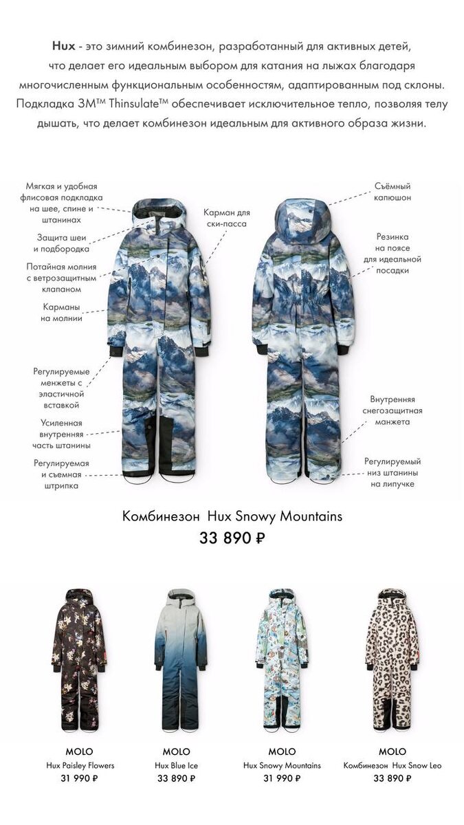 Комбинезоны MOLO – легкие, удобные и при этом очень теплые, благодаря высокотехнологичному утеплителю и мягкой подкладке