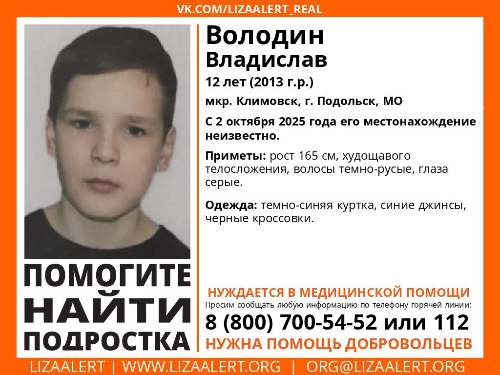 В Подмосковье ищут пропавшего мальчика Уже несколько дней о судьбе подростка ничего не известно Волонтёры поисково-спасательного отряда «Лиза Алерт» присоединились к поискам 12-летнего Володина Владислава Валерьевича. Мальчик нуждается в медицинской помощи. Последний раз его видели 2 октября в микрорайоне Климовск, город Подольск, Московская область. Приметы: Рост: 165 см Телосложение: худощавое Волосы: темно-русые Глаза: серые Парень был одет в темно-синюю куртку, синие джинсы и черные кроссовки. Если вы видели Владислава или располагаете какой-либо информацией о его местонахождении, пожалуйста, сообщите по телефонам, указанным в ориентировке или свяжитесь с ближайшим отделением полиции. Любая информация может быть важна!