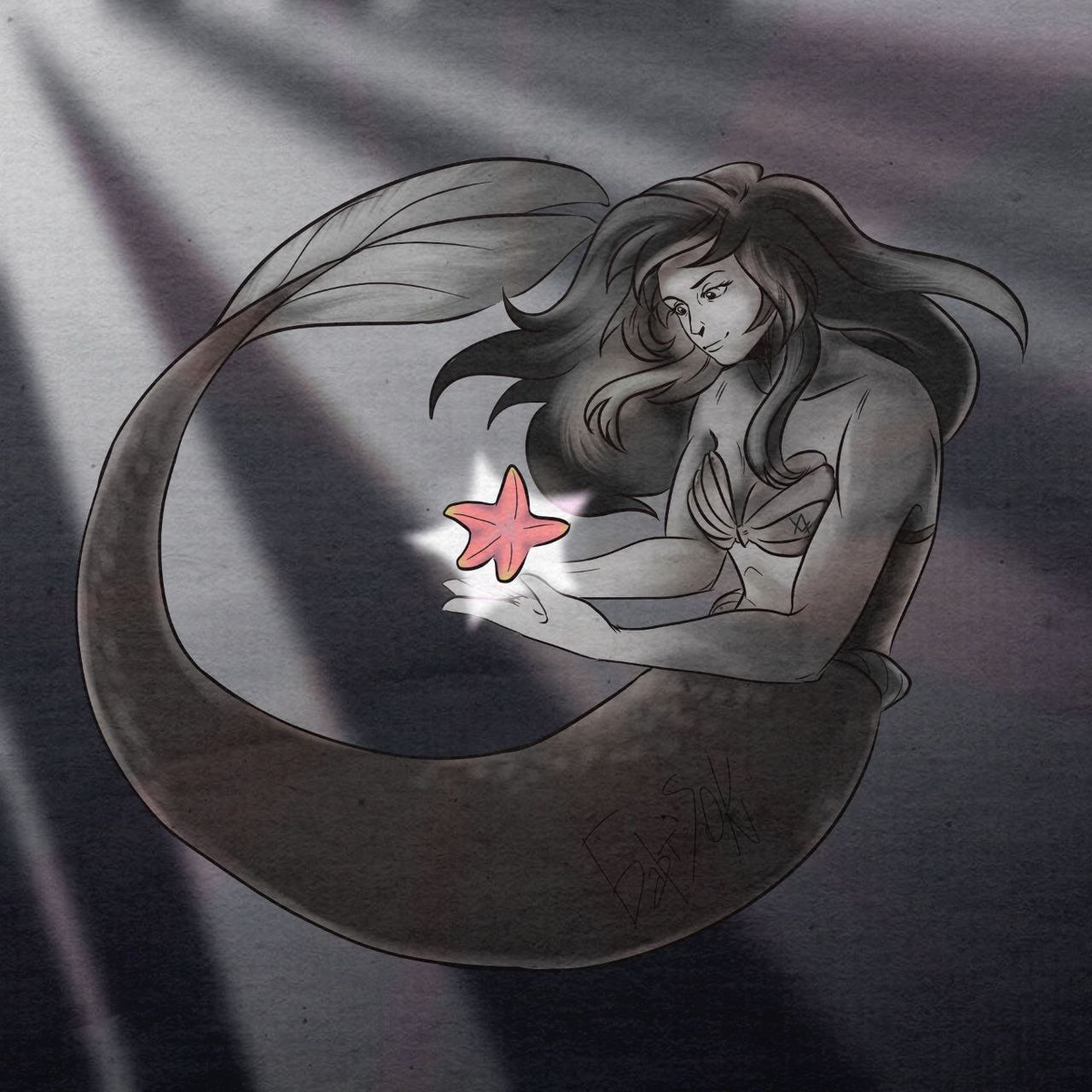Глубоко под водой, где царят безмолвие и полумрак, русалка нашла настоящее сокровище. Яркая морская звезда в её руках сияет, словно маяк, освещая всё вокруг своим светом. Всего одна деталь оживляет всю иллюстрацию седьмого дня челленджа — Starfish (морская звезда). Автор арта: @sanek_bratan_tg