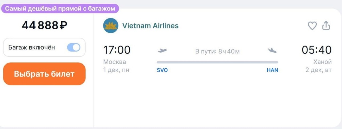 ➡️Билеты на третий рейс Vietnam Airlines уже в продаже – от 44,9 тыс. руб. в одну сторону с багажом.