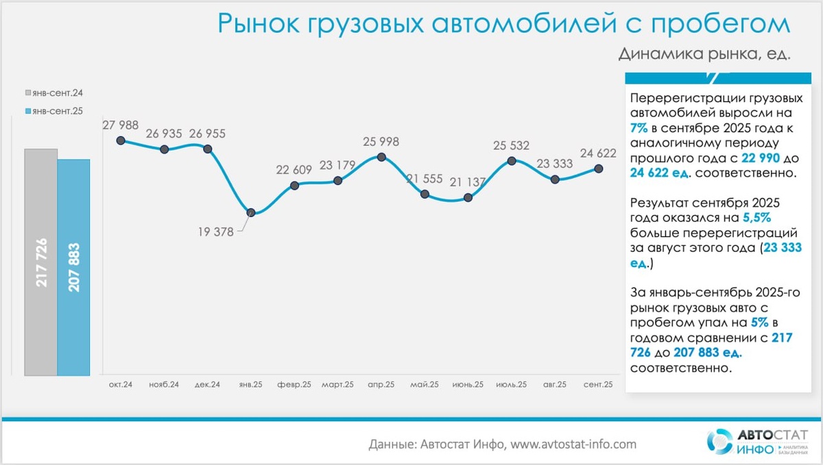 Подержанные грузовики: рынок прибавил в сентябре, но остается ниже прошлого года По данным «Автостат Инфо», вторичный рынок грузовых автомобилей в сентябре 2025 года ускорился: количество перерегистраций выросло на 7% год к году — с 22 990 до 24 622 ед., а к августу добавились еще 5,5% (с 23 333 ед.). В накопленном выражении за январь–сентябрь рынок снизился на 5% относительно прошлого года — с 217 726 до 207 883 ед., то есть до уровня, близкого к «норме» 21–25 тыс. сделок в месяц, видимой по траектории последних пяти месяцев. Структура спроса по маркам в сентябре выглядит сбалансированно, но с заметным ростом долей китайских брендов. Лидирует Камаз — 5 838 ед., что эквивалентно 23,7% всех сделок месяца и на 6% выше прошлогоднего результата. ГАЗ занимает 8,8% рынка (2 176 ед., +4% г/г). В тройку самых быстрорастущих вошли Shacman и Sitrak: 1 438 ед. (+56% г/г; доля 5,8%) и 1 183 ед. (+224% г/г; доля 4,8%) соответственно. Стабильный спрос у Volvo — 1 327 ед. (5,4%; −4% г/г) и МАЗ — 1