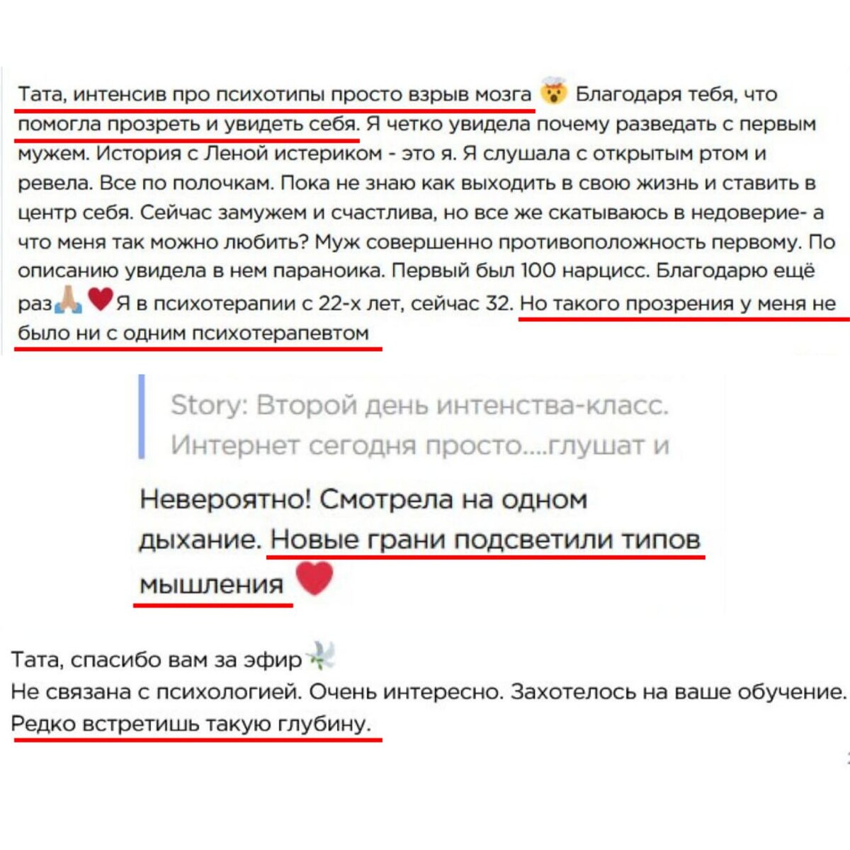 «Я слушала с открытым ртом и ревела. История с Леном истериком - это я. Сейчас замужем и счастлива, но все же скатываюсь в недоверие - а что меня так можно любить?» Получила немало подобных сообщений после интенсива «Как читать людей по лицам» Так можно ли любить кого-то просто так, ни за что? Да, можно! Как? И что же делать с недоверием? Необходимо глубоко погрузиться и изучить свой тип личности в первую очередь. Понять и принять себя. Когда вы не знаете свой тип личности и живете не по своей природе, скатывание в недоверие, в непонимание, в тревожные состояния неизбежно! В первый день интенсива я, как раз, разобрала 3 основных типа личности, которые лежат в основе личности 90% людей: истерик, параноик и нарцисс. Почему одни - такие, а другие - другие? И что с этой красотой нам делать в реальной жизни. Этот день прошел под углом разбора себя - «Кто я». А чтобы научиться понимать других людей, их мотивы, что они от вас хотят - вам нужно научиться считывать свойственные другим ти
