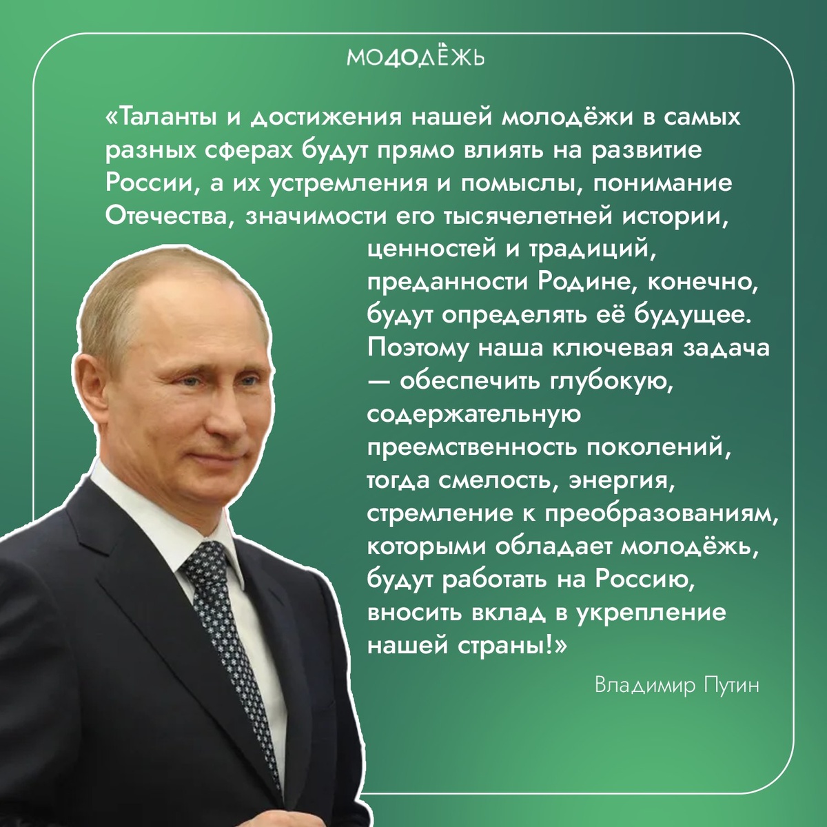 С Днём рождения, #МойПрезидент 🇷🇺 🇷🇺 Сегодня — день рождения Владимира Путина. Его внимание к молодёжи, поддержка талантов и стремление создавать новые возможности для самореализации помогают нам смело смотреть в будущее и верить в собственные силы! #Молодёжь40 желает Владимиру Владимировичу крепкого здоровья, неиссякаемой энергии и новых достижений на благо Отечества! #УМП40 #Молодёжь40