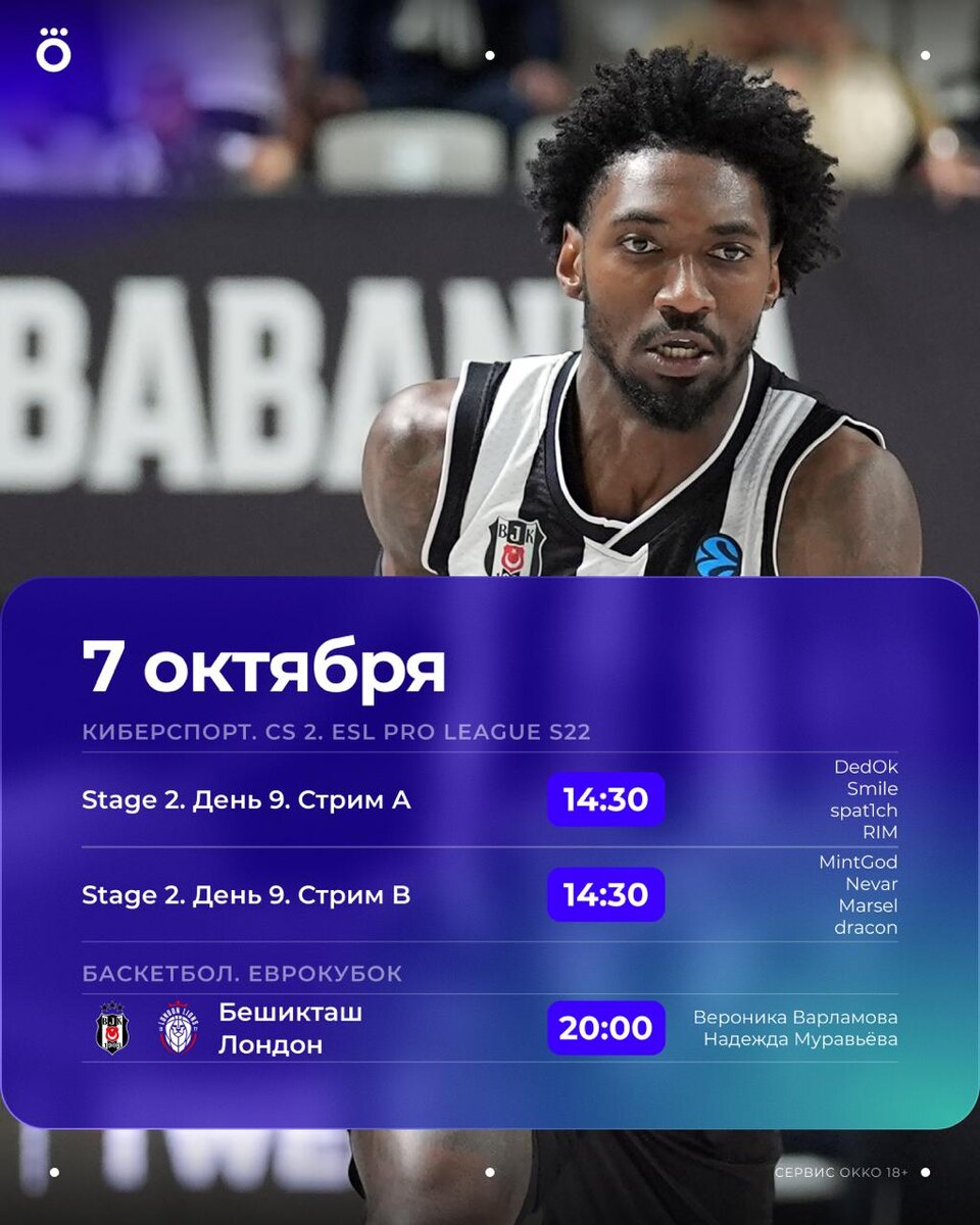 Баскетбольный Еврокубок и ESL Pro League Season 22 по CS 2. Такое расписание на этот вторник 🏀🎮