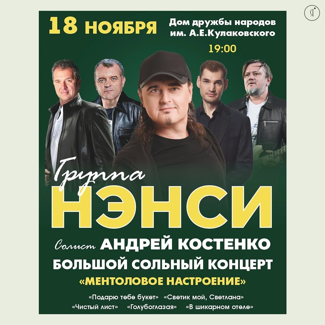 Нэнси «Ментоловое настроение» #Концерты Нэнси — музыкальная поп-рок группа, которая была создана в 1992 году. За время существования группа записала более 20 альбомов. Множество песен («Дым сигарет с ментолом», «Чистый лист», «Ива», «Отель» и тд) стали супер хитами! Коллектив выпускает и новые композиции, которые тоже прозвучат на грядущем выступлении. 18 ноября | 19:00 ДДН имени А.Е. Кулаковского 2400-4200 руб. sakhaconcert.ru Online Якутия | Ждем вас в МАХ