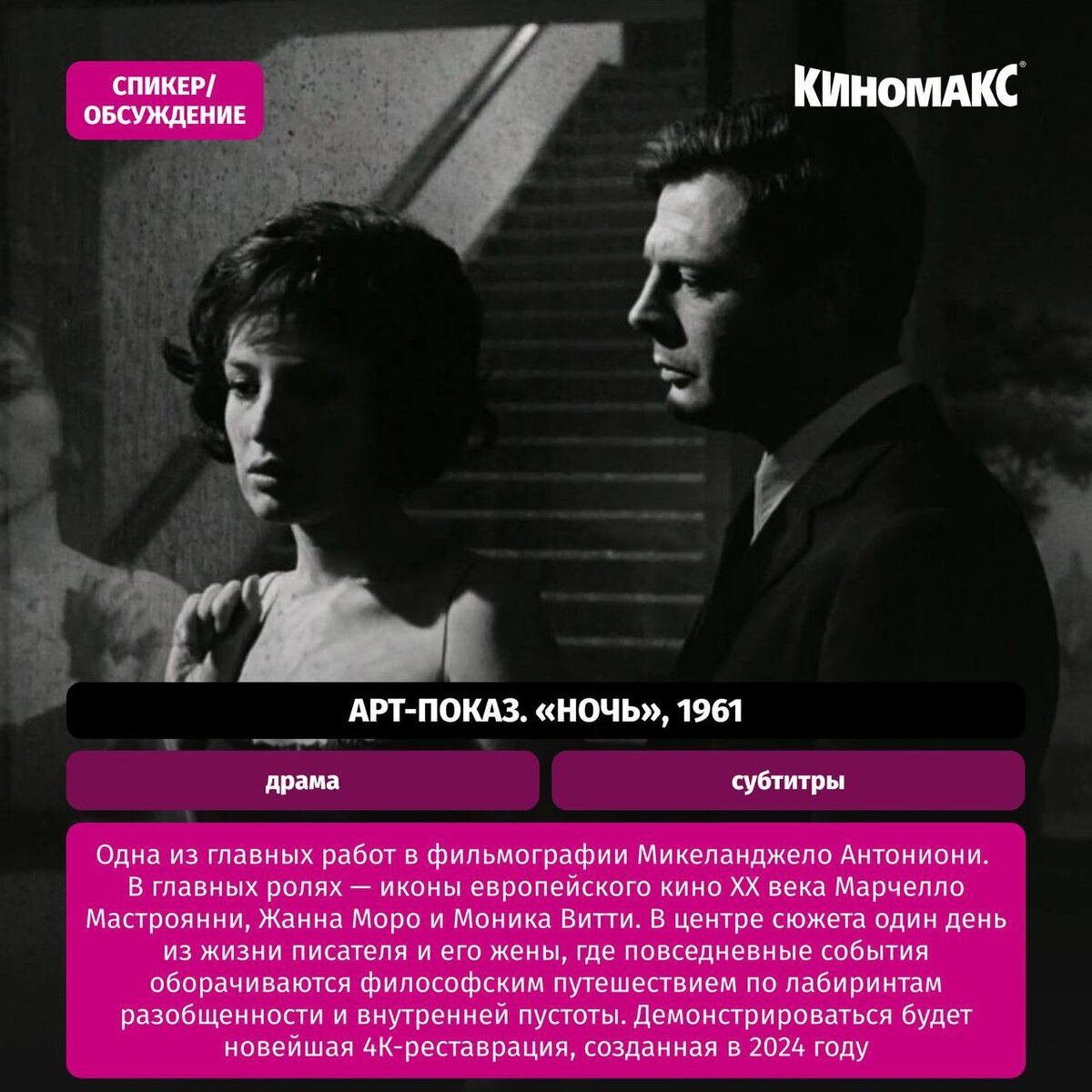 πΠΠ΄Π½Π° ΠΈΠ· Π³Π»Π°Π²Π½ΡΡ ΡΠ°Π±ΠΎΡ Π² ΡΠΈΠ»ΡΠΌΠΎΠ³ΡΠ°ΡΠΈΠΈ ΠΠΈΠΊΠ΅Π»Π°Π½Π΄ΠΆΠ΅Π»ΠΎ ΠΠ½ΡΠΎΠ½ΠΈΠΎΠ½ΠΈ. Π Π³Π»Π°Π²Π½ΡΡ ΡΠΎΠ»ΡΡ β ΠΈΠΊΠΎΠ½Ρ Π΅Π²ΡΠΎΠΏΠ΅ΠΉΡΠΊΠΎΠ³ΠΎ ΠΊΠΈΠ½ΠΎ XX Π²Π΅ΠΊΠ° ΠΠ°ΡΡΠ΅Π»Π»ΠΎ ΠΠ°ΡΡΡΠΎΡΠ½Π½ΠΈ, ΠΠ°Π½Π½Π° ΠΠΎΡΠΎ ΠΈ ΠΠΎΠ½ΠΈΠΊΠ° ΠΠΈΡΡΠΈ. Π ΡΠ΅Π½ΡΡΠ΅ ΡΡΠΆΠ΅ΡΠ° ΠΎΠ΄ΠΈΠ½ Π΄Π΅Π½Ρ ΠΈΠ· ΠΆΠΈΠ·Π½ΠΈ ΠΏΠΈΡΠ°ΡΠ΅Π»Ρ ΠΈ Π΅Π³ΠΎ ΠΆΠ΅Π½Ρ, Π³Π΄Π΅ ΠΏΠΎΠ²ΡΠ΅Π΄Π½Π΅Π²Π½ΡΠ΅ ΡΠΎΠ±ΡΡΠΈΡ ΠΎΠ±ΠΎΡΠ°ΡΠΈΠ²Π°ΡΡΡΡ ΡΠΈΠ»ΠΎΡΠΎΡΡΠΊΠΈΠΌ ΠΏΡΡΠ΅ΡΠ΅ΡΡΠ²ΠΈΠ΅ΠΌ ΠΏΠΎ Π»Π°Π±ΠΈΡΠΈΠ½ΡΠ°ΠΌ ΡΠ°Π·ΠΎΠ±ΡΠ΅Π½Π½ΠΎΡΡΠΈ ΠΈ Π²Π½ΡΡΡΠ΅Π½Π½Π΅ΠΉ ΠΏΡΡΡΠΎΡΡ. ΠΠ΅ΠΌΠΎΠ½ΡΡΡΠΈΡΠΎΠ²Π°ΡΡΡΡ Π±ΡΠ΄Π΅Ρ Π½ΠΎΠ²Π΅ΠΉΡΠ°Ρ 4Π-ΡΠ΅ΡΡΠ°Π²ΡΠ°ΡΠΈΡ, ΡΠΎΠ·Π΄Π°Π½Π½Π°Ρ Π² 2024 Π³ΠΎΠ΄Ρ