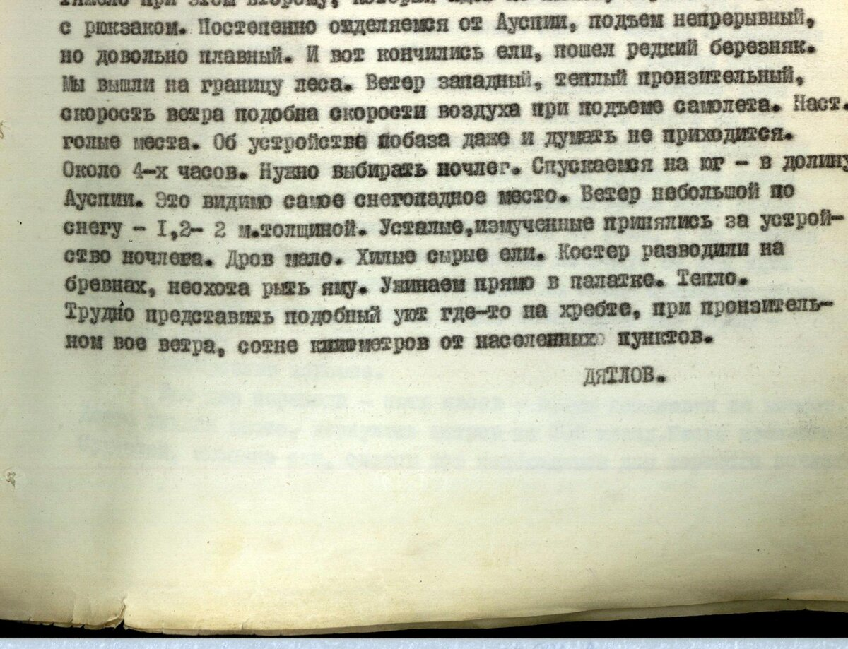 Изучая материалы дела, я постоянно нахожу подтверждение мои выводам по поводу ночевки группы Дятлова возле кедра. В этой статье хочу привести ещё пару фактов. Считаю очень важно понять в каком месте группа вышла из леса отдаляясь от Ауспии. Почему это важно? Потому что тогда можно точно сказать могли ли они ночевать там, где был найден лабаз или даже это скорей можно назвать схроном в снежном сугробе. Я уже писал и повторю ещё раз. Лабаз подразумевает некое хранилище в том числе и продуктов. Обычно делается в лесной зоне. Задача этого хранилища невозможность добраться до продуктов обитателей леса. Поэтому закапывать продукты в снежный сугроб – это все равно что пригласить диких животных откушать всяких вкусностей. Почему я снова это объясняю? Об этом напишу дальше. Так вот. Судя по описанию из общего дневника, туристы решили уйти от Ауспии в сторону Отортена. Потому что одним из пунктов этого похода была вершина горы Отортен. Из записи мы можем понять, что, отдаляясь от Ауспии группа ш
