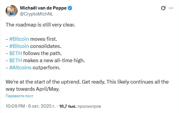 Дорожная карта по-прежнему предельно ясна: Сначала движется биткоин. Затем биткоин консолидируется. Ethereum повторяет его путь. Ethereum обновляет исторический максимум. Потом альткоины показывают лучшую динамику. Мы в начале восходящего тренда. Готовьтесь — скорее всего, он продлится до апреля–мая.