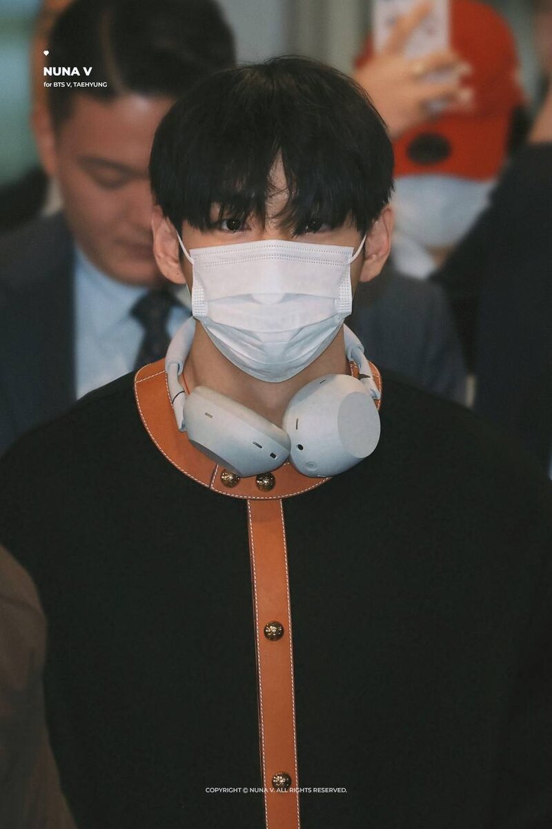 Тэхен прилетел в том же образе, в котором улетал из Парижа. К образу Celine Тэ только добавил синий платок - который был приглашением на этот показ.