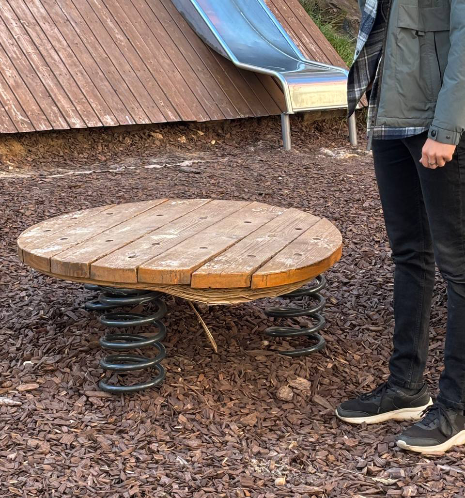 Хорошо: яркий объект сюжетной игры, виден издалека; древесная щепа снижает травмоопасность, «утопленное» положение уменьшает высоту падения.