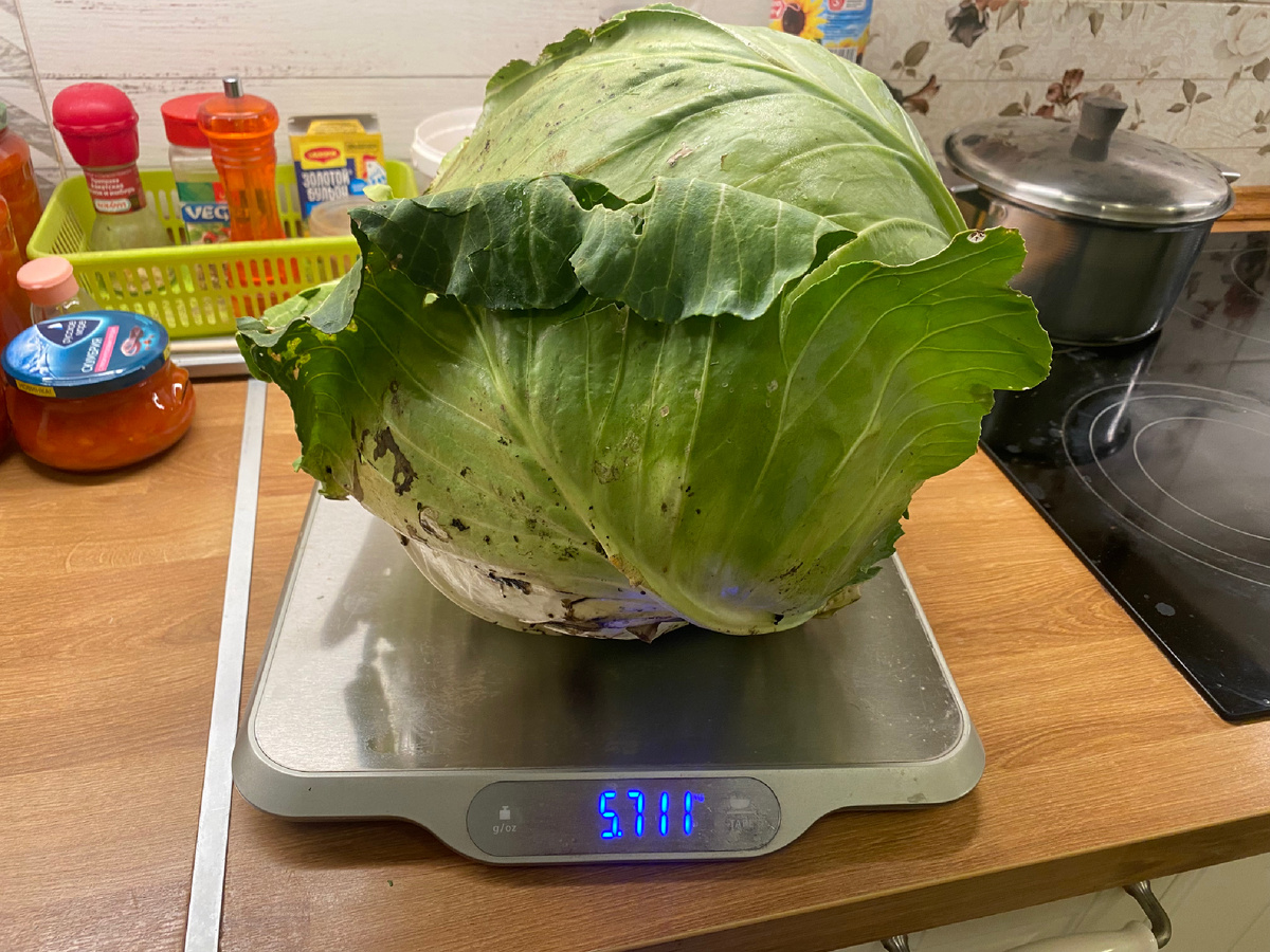 Капуста весом почти 6 кг привезена мной в город на голубцы. Завтра буду их крутить и стожить в морозилку на зиму, чтобы вот так вот захотелось голубцов - и ррррраз! - а они уж готовые в морозилке, только потушить и никакой возни)