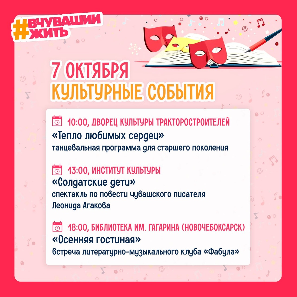 #вчувашиижить – культурно вторник проводить Душевными могут быть не только выходные, но и будни! Нужно лишь отвлечься от рабочей рутины и посвятить время себе любимому. ❤️🩹 Станцевать, вдохновиться спектаклем, спеть под гитару и прочитать стихи... И сделать все это в приятной компании единомышленников. ⬆️Делимся подборкой таких мероприятий на сегодня. Подписаться / Предложить новость
