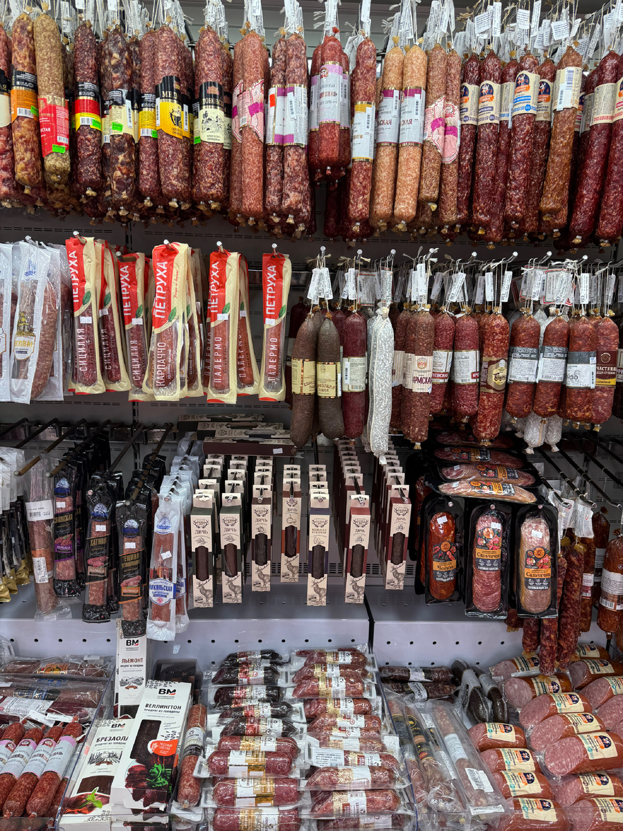 Беларусь славится своими потрясающими продуктами из мяса и молока! Они действительно очень вкусные, натуральные, а их разнообразные поражает! Я стараюсь брать максимально разные продукты: от сврокопченых колбас до рулетов из субпродуктов. В этот раз я взяла: рулет из свиных ушей, рулет из рульки, два вида сала (по-белорусские и парижское), палендвицу и кровяную колбасу. Брала небольшими кусочками Посмотрите, как нарядно смотрится рулет из свиных ушек! Он ниже. А выше - рулет из рульки. Стоимость рулета из ушек всего 5 белорусских рублей за килограмм (около 120 российских), а внешний вид, вкус и полезность намного дороже! Рулет из рульки с перцем и чесноком - типичное блюдо белорусской кухни, помню его вкус с детства! А кровянка - лучшее средство от анемии! Две палки сыровяленой колбасы, деликатес к кофе, наш любимый дедушка собрал нам гостинец и тоже с колбасой , поэтому много не покупали. Йогурты на завтрак, сгещенка Рогочнвсконо комбината (обычная и вареная), конфеты Пуща с яблоч