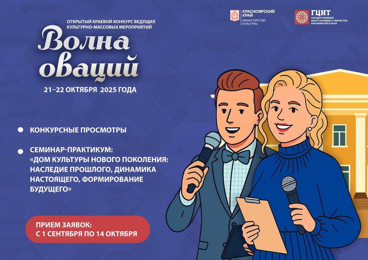 🎤Открытый краевой конкурс ведущих культурно-массовых мероприятий «Волна оваций» - 2025! К участию приглашаются методисты, художественные руководители, организаторы досуга, сценаристы, режиссёры, специалисты домов и центров народного творчества, работники образования и все заинтересованные специалисты. В программе: 🔹конкурс ведущих культурно-массовых мероприятий по номинациям: 🔸«Ведущий детских игровых программ» 🔸«Ведущий молодёжных событий» 🔸«Ведущий программ для семейной аудитории» 🔸«Ведущий мероприятий для пожилых людей» 🔹семинар-практикум: «Дом культуры нового поколения: наследие прошлого, динамика настоящего, формирование будущего»: мастер-классы по организации культурно-досуговой деятельности, направленной на реализацию национального проекта «Семья». Обсудим: 🔸 Просветительские формы работы для детской и семейной аудитории. 🔸 События для держателей Пушкинской карты. 🔸 Мероприятия для старшего поколения в рамках региональной программы «Сибирское активное долголетие».