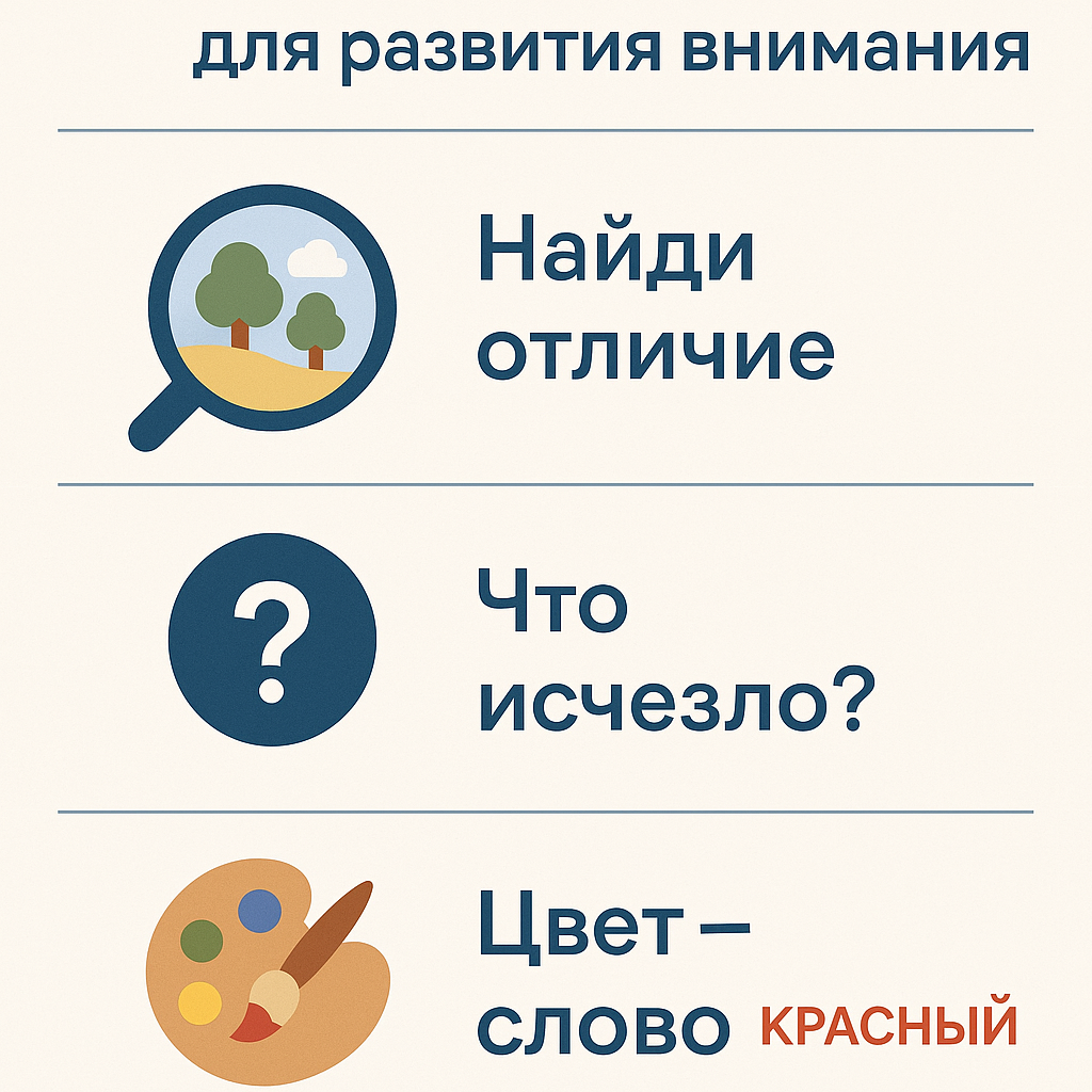 Многие родители замечают: ребёнок быстро устает, отвлекается, теряет интерес к занятиям. На самом деле внимание — это навык, который можно развивать, и делать это лучше в игровой форме. Онлайн-задания помогают тренировать концентрацию без скуки и принуждения. Почему онлайн-формат работает: – на экране легко удержать интерес: всё ярко и динамично; – педагог подбирает уровень сложности под конкретного ребёнка; – занятия короткие и разнообразные — без перегрузки. 3 онлайн-игры для развития внимания: «Найди отличие» — ребёнок сравнивает две картинки и находит 5 отличий. «Что исчезло?» — педагог показывает ряд предметов, затем убирает один. Нужно вспомнить, чего не хватает. «Цвет – слово» — на экране написаны слова разным цветом. Нужно назвать не слово, а цвет шрифта. Каждое из этих упражнений развивает разные типы внимания — зрительное, слуховое и переключаемое. Вывод: онлайн-задания помогают ребёнку учиться сосредотачиваться, запоминать и выполнять инструкции. А всё это — основа