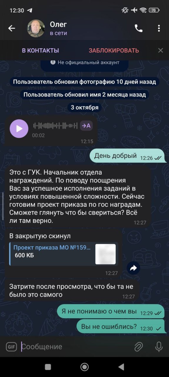 ⬆️В примере рассылка по соцсетям и мессенджерам в которой злоумышленники, представляясь сотрудниками штабов, рассылают военнослужащим фиктивные приказы о награждении. Под видом «уточнения данных» или «заполнения документов» они пытаются выявить должностных лиц батальонов, полков, бригад и дивизий, а также получить иную информацию.