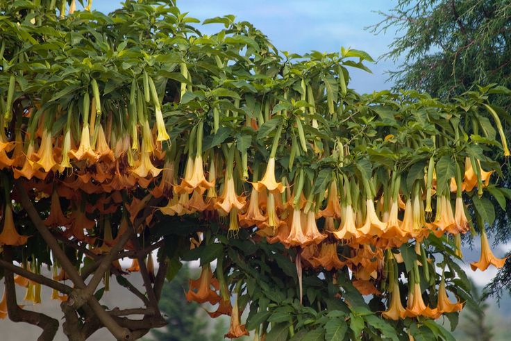 Огромное, скажу я вам, впечатление произвело на меня растение под названием Бругмансия. Встречали такое? Его еще называют "Ангельские трубы" за цветки интересной формы. Размер этих поникающих цветков, похожих на граммофоны, действительно впечатляет - они не меньше 40-45 см в длину, и в зависимости от вида бывают желтого, розового, белого или оранжевого цвета, простыми, махровыми, двухуровневыми, да еще и обладают замечательным ароматом. В общем, я любовалась им во всяких теплых странах и фотографировала со всех ракурсов, но думать не думала, что эти Ангельские трубы могут произрастать у нас на участках, да еще и в открытом грунте. И цвести в октябре... Оказывается, и растут, и цветут, и прекрасно себя чувствуют, хотя, конечно, не зимуют - эти растения выдерживают морозы до минус пятнадцати при условии очень тщательного укрытия, а у нас на даче зимой минус тридцать два. Так что вариант "посадил и забыл" тут точно не получится. Либо нужно выращивать Бругмансию в горшках и на зиму унос