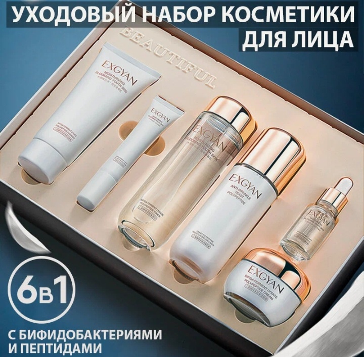 - Косметика — это не просто средство ухода, а истинное искусство заботы о себе. Подарочный набор Exgyan 6 в 1 станет отличным вариантом для тех, кто стремится подчеркнуть свою красоту и ухаживать за кожей лица. В этом наборе собраны лучшие уходовые продукты, которые не только приятно использовать, но и приносят видимые результаты.