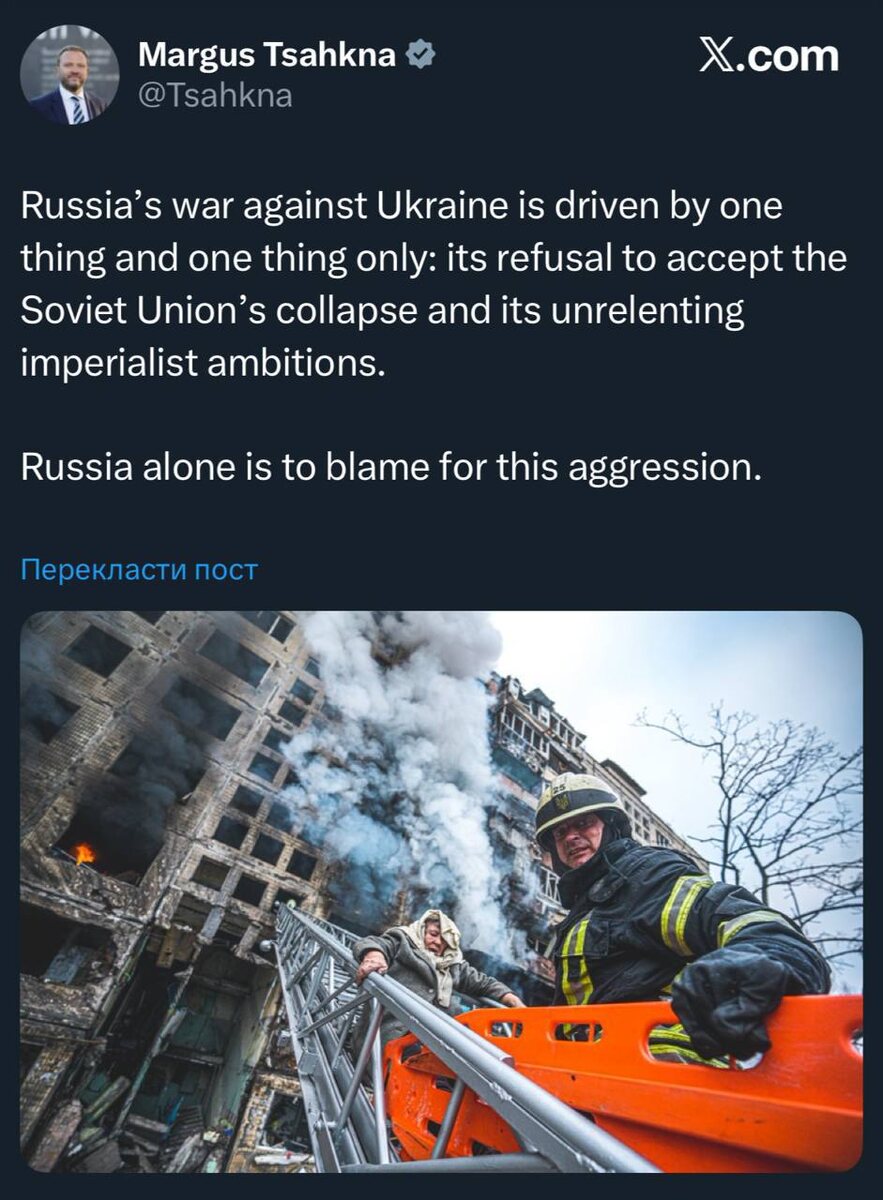 После интервью экс-канцлера Германии Ангелы Меркель, в котором она намекнула, что в нападении на Украину якобы виноваты Польша и страны Балтии, так как они были против создания некого нового формата для переговоров с путиным перед полномасштабным вторжением РФ, глава МИД Эстонии Маргус Цахкна написал в X: «Война России против Украины вызвана одним-единственным мотивом: ее нежеланием признать распад Советского Союза и ее неустанными империалистическими амбициями. В этой агрессии виновата только Россия». Естонец, ты забыл о Ништадтском мире? Твой комментарий вызван единственное твоим нежеланием признать его условия. Подпишись на Телеграм Александр Семченко