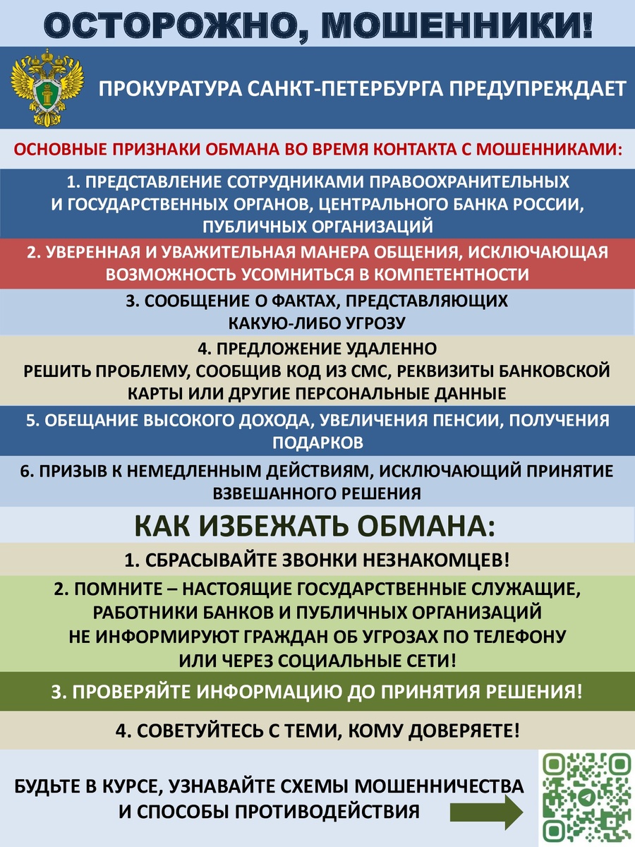 🚨ОСТОРОЖНО МОШЕННИКИ Прокуратура Санкт-Петербурга напоминает об основных признаках мошенников и способах противодействия им ⬆️ 🗯️Фразы, которые точно не нужно слушать до конца: 🗣️ «Перевожу вас на сотрудника Центробанка/ правоохранительных органов» 🗣️ «Звоню по поводу удаленной работы» 🗣️ «Это отдел курьерской доставки, на ваше имя поступила посылка» 🗣️ «Ваш аккаунт на портале «Госуслуг» взломан, неизвестные пытаются получить доступ к вашей учетной записи» 🙌Будьте бдительны!🙌