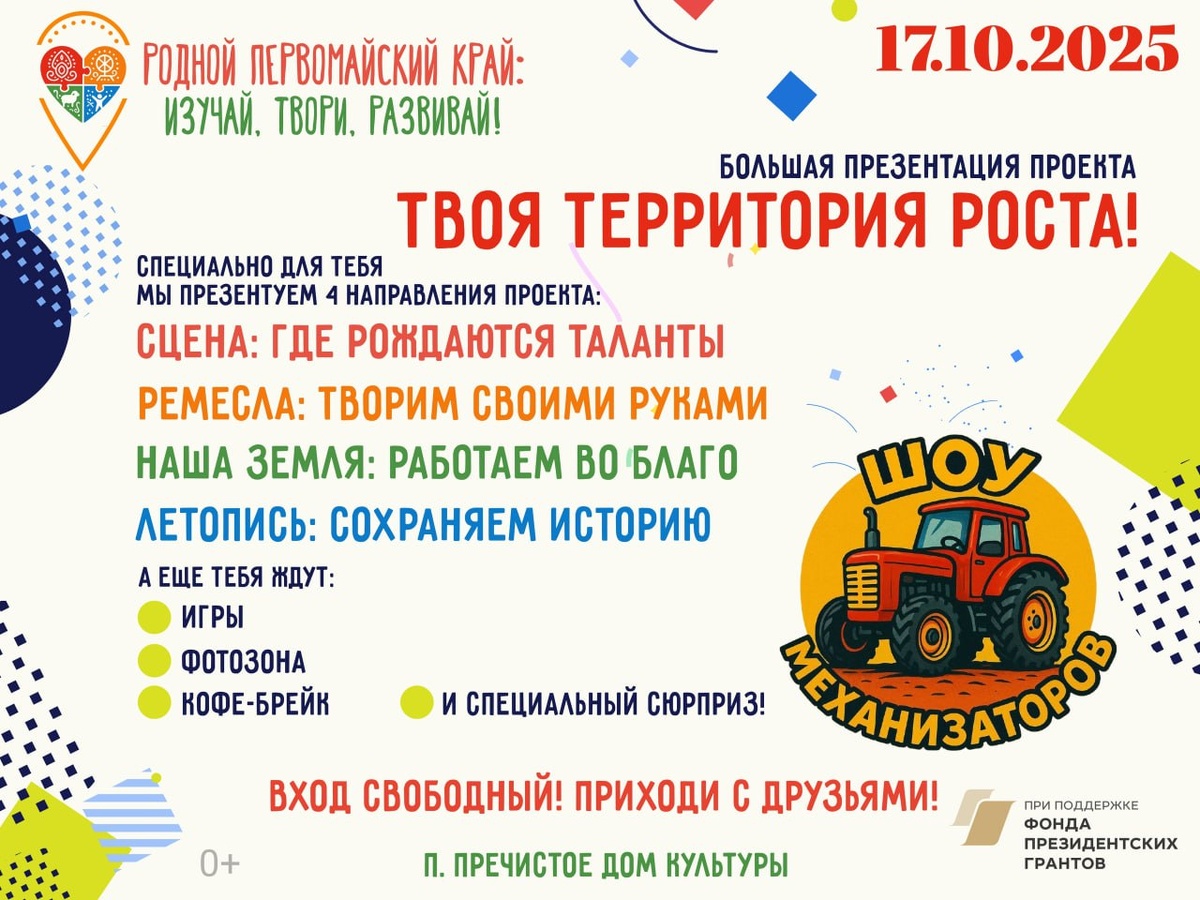 😱 В пятницу, 17 октября, в посёлке Пречистое состоится презентация проекта «Родной Первомайский край: изучай, твори, развивай», который реализует АНО «Юрьевская мастерская» при поддержке Фонда президентских грантов. Встреча пройдёт в поселковом Доме и культуры.